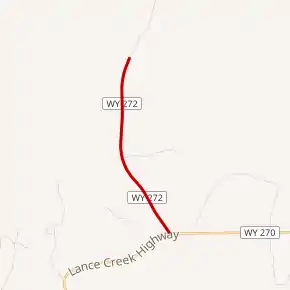 Wyoming Highway 272 has its southern end at Wyoming Highway 270, northeast of Lance Creek. WYO 272 heads north into the Lance Creek Fossil Area. Highway 272 ends at 3.32 miles and Niobrara County Route 14 takes over as the northern routing.[2][3]