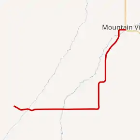 About 0.3 miles (0.48 km) north of the WYO 411 junction, and after it crosses Smiths for a second time, WYO 410 begins running briefly along the western city limits of Mountain View as West Street before turning east and entering the town along West 2nd Street. (West Street continues north for several blocks.) After turning east, WYO 410 crosses Spruce, Pine, and Cedar streets, before connecting with the north end of Birch Street on the south side of Mountain View Middle School. Just after connecting with the south end of North Alder Street, WYO 410 reaches is eastern terminus at it junction with Wyoming Highway 414 (WYO 414) at a T intersection. (WYO 414 heads north through Urie and Lyman before ending at an interchange with Interstate 80 and Wyoming Highway 412. WYO 414 head southeasterly through Lonetree and McKinnon before ending at the Utah State Line.)[4][6]