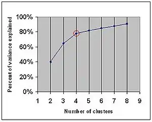 The elbow method looks at the percentage of explained variance as a function of the number of clusters: One should choose a number of clusters so that adding another cluster doesn't give much better modeling of the data. More precisely, if one plots the percentage of variance explained by the clusters against the number of clusters, the first clusters will add much information (explain a lot of variance), but at some point the marginal gain will drop, giving an angle in the graph. The number of clusters is chosen at this point, hence the "elbow criterion". This "elbow" cannot always be unambiguously identified,[1] making this method very subjective and unreliable. To overcome this, a quantity called "elbow strength" was introduced in 2021 and its success in determining the number of clusters in an automated way was demonstrated.[2] Percentage of variance explained is the ratio of the between-group variance to the total variance, also known as an F-test. A slight variation of this method plots the curvature of the within group variance.[3]