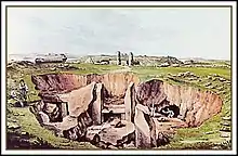 The Xagħra Stone Circle was first recorded by Jean Houel in 1788. In the 1820s, Otto Bayer excavated part of the complex through a collapsed cave roof, and Charles Frederick de Brocktorff painted several paintings showing the site during this excavation. The site was filled in by the late 1830s, and its exact location was lost over time.[4] The two monumental pillars which formed the circle's entrance still stood in 1828,[2] but they were subsequently removed.[3]