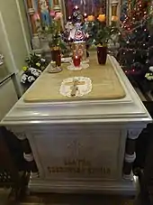 Xenia's grave is in the Smolensky Cemetery of St. Petersburg. It has been marked by an ornate chapel since 1902. She was canonized by the Russian Orthodox Church Outside Russia on September 24, 1978 (O. S. September 11, 1978) in Synodal Cathedral of Our Lady of the Sign in New York, USA and by Russian Orthodox Church on June 6, 1988 during Local Council of the Russian Orthodox Church. Her feast day in the O.S. is January 24, which is February 6 in the New Calendar. In July 2020, the Holy Synod of the Romanian Orthodox Church also resolved to include Xenia of St. Petersburg in its calendar on January 24.[1]
