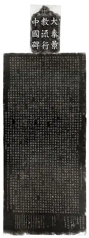 The Xi'an Stele or the Jingjiao Stele (Chinese: 景教碑; pinyin: Jǐngjiào bēi), sometimes translated as the "Nestorian Stele," is a Tang Chinese stele erected in 781 that documents 150 years of early Christianity in China.[1] It is a limestone block 279 centimetres (9 ft 2 in) high with text in both Chinese and Syriac describing the existence of Christian communities in several cities in northern China. It reveals that the initial Church of the East had met recognition by the Tang Emperor Taizong, due to efforts of the Christian missionary Alopen in 635.[2] According to the Stele, Alopen and his fellow Syriac missionaries came to China from Daqin (the Eastern Roman Empire) in the ninth year of Emperor Taizong (Tai Tsung) (635), bringing sacred books and images.[3] The Church of the East monk Adam (Jingjing in Chinese) composed the text on the stele.[4] Buried in 845, probably during religious suppression, the stele was not rediscovered until 1625. It is now in the Stele Forest in Xi'an.