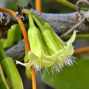 The flowers are fragrant, small, coloured white, yellow-green or pink and are about 5 to 10 mm (0.2 to 0.4 in) long. They grow on branched inflorescences, which are either pedunculate racemose or umbelliform cymes, that are on pedicles 3-7mm long. Fruits are shaped globose, subglobose, drupaceous or ellipisoid, grow up to 3 cm long, have a diameter of 2.5 cm and are smooth.[6][7][8] Fruits are green when they are young but turn golden-yellow or yellow (and rarely orangish-red) as they ripen.[6][8][10] When ripe, the fruit has a green, juicy pulp, and one large endospermic seed, that has a small embryo and thin testa. The seed is woody and coloured light-yellow and grows up to 1.5 cm long with a diameter of 1.2 cm, and has about 60% oil content.[6][7][8][10] The fruit is "refreshing" when eaten and is said to have "an almond-acid taste".[7][8] Climatic conditions do not affect the maturation and ripening of X. americana,[6][7] but flowering is commonly observed during dry seasons.[7] The trees produce fruit after about 3 years of growing,[7] which are then dispersed by animals.[10]