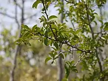 Leaves are simple, alternate or clustered on spur shoots, having a lanceolate (spear-like) to elliptic (oval) shape, are either obtuse, emarginate or retuse at the apex, and have a texture similar to leather. The leaves grow up to 2.5 to 8 cm (1 to 3 in) long and 1 to 4 cm (0.4 to 1.6 in) wide, have a thickness ranging from thin to semisucculent and have 3 to 7 pairs of lateral veins that are difficult to observe on both sides of the leaf. They curve upwards along the midrib.[6][7][8] Leaves are hairy as they first start growing, but become smooth and shiny as they mature.[9] The petioles are short and thin, growing up to 3 to 6 mm (0.1 to 0.3 in) long. They are canaliculated, smooth and have a grey-green colour and flesh that is either leathery or thin.[6][7][8][9]