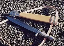 The xiphos (Ancient Greek: ξίφος [ksípʰos]; plural xiphe, Ancient Greek: ξίφη [ksípʰɛː])[1] is a double-edged, one-handed Iron Age straight shortsword used by the ancient Greeks. It was a secondary battlefield weapon for the Greek armies after the dory or javelin. The classic blade was generally about 45–60 cm (18–24 in) long, although the Spartans supposedly preferred to use blades as short as 30 cm (12 in) around the era of the Greco-Persian Wars. The xiphos sometimes has a midrib, and is diamond or lenticular in cross-section. It was a rather light weapon, with a weight around 450–900 g (0.99–1.98 lb). It was generally hung from a baldric under the left arm.[2] The xiphos was generally used only when the spear was broken, taken by the enemy, or discarded for close combat. Very few xiphe are known to have survived.