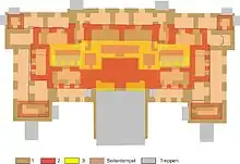 After the completion of the building a staircase was set on the back that leads up to the roof of the room. There, a small room was probably built or at least planned. In order to stabilize the roof for that extra space, the back wall was reinforced to almost half of the vault with a masonry core, which was covered on the front with stucco. From the back of a reconstructed in its lower part staircase leads to the upper room. The staircase has at its center a central stair stringer, which is designed as a tail or abdomen of the reptile, and the turn ends in a small snake throat.