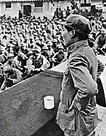The critic-historian Claire Roberts observes that this 1938 photograph of Mao making a speech at Yan'an "presaged his leadership of the country". She analyzes the message of the photograph by saying that Mao "stands in profile to the right of the frame, his hands placed confidently on his hips, towering over a crowd of soldiers". This pose, she continues, was an "unusual side-on view," in contrast to the traditional way of depicting leaders in a "frontal view in order to emphasize their integrity and authority." But Xu explained his choice in a practical way, saying "If I had stood in front, I would have had to stand in the middle of the crowd", so "all I could do was move over to the side and take the shot".[8]