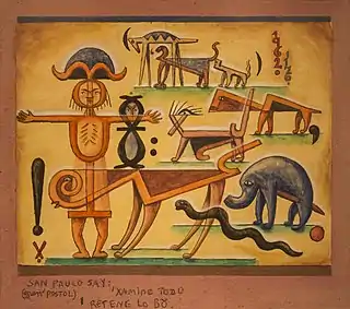 Gradowczyk describes Xul at this point in his life as “a visionary rabidly opposed to the canons reigning in the Buenos Aires of his time".[1] Like other artistically-inclined people of his generation, Xul sought to study in Europe, and settled for a time in Paris while it was an epicenter for avant-garde art. The city was home to the Cubists, while attracting Italian futurists, Russian artists, and participating in the dialogue about German Expressionism. There was also a fashion for sculpture and objects brought back to Europe by anthropologists and traders from African and Pacific Ocean colonies, as well as the Americas.[1]