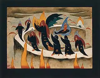 The artistic canons that Gradowczyk refers to were propagated by the official Argentine art institutions, who favored visual representations associated with national icons.[1] Painters like Carlos P. Ripamonte, Cesáreo Bernaldo de Quirós, and Fernando Fader extolled images of pampas landscapes and rural gaucho culture.[6] The arrival of Spanish intellectuals such as José Ortega y Gasset and Eugenio D’Ors created a new discourse around art that was disseminated among writers and artists working toward an aesthetic modernity.[6] Entierros firmly places Xul Solar as a member of this modernist Argentine movement. Rather than painting subjects recognizable as Argentine, Xul's focus is internal, painting from his own imagination. His early artistic output seems to represent the profusion of ideas and themes that grew out of Xul's contemplations. The flat shapes and bold colors used in the painting demonstrate a Cubist influence. The faces of the figures, particularly the eyes and shapes of heads can be seen as owing to the fashion for art and artifacts from Africa and the Americas mentioned above.