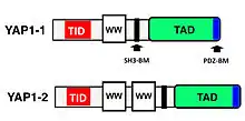 Cloning of the YAP1 gene facilitated the identification of a modular protein domain, known as the WW domain.[8][9][10] Two splice isoforms of the YAP1 gene product were initially identified, named YAP1-1 and YAP1-2, which differed by the presence of an extra 38 amino acids that encoded the WW domain.[11][12] Apart from the WW domain, the modular structure of YAP1 contains a proline-rich region at the very amino terminus, which is followed by a TID (TEAD transcription factor interacting domain).[13] Next, following a single WW domain, which is present in the YAP1-1 isoform, and two WW domains, which are present in the YAP1-2 isoform, there is the SH3-BM (Src Homology 3 binding motif).[5][14] Following the SH3-BM is a TAD (transcription activation domain) and a PDZ domain-binding motif (PDZ-BM) (Figure 1).[15][16]