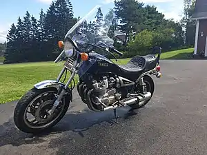 The Yamaha XJ1100 is a Japanese standard motorcycle that was produced for only one year in 1982 in the US and 1983-84 in Canada. This motorcycle employed almost the same motor as its predecessor, the XS 11. The motor was a four-stroke, transverse-mounted four-cylinder engine with dual overhead cams. Its 1101cc engine was making 95 hp at the crank, paired with a 5-speed gearbox and shaft drive.[1]