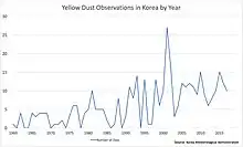 In the last half century, the number of days with reports of Asian dust has increased five-fold.[19] According to an analysis on data from Korea Meteorological Administration (KMA), the average number of days with Asian dust in a given year was about two in the 1960s. However, this number has increased to 11 in 2000s. In 1960s and 1970s, each decade had 3 years that were Asian-dust free. However, starting from 2000s, there has not been a single year without Asian dust.[19] In just four months of 2018, Gyeonggi Province of South Korea issued 42 dust warnings and advisories, which has increased from 36 in the same period in 2017.[12] This reflects the increase in average dust concentration level from 132.88 ppm (parts per million) in 2017 to 149 ppm in 2018. The situation is worsening since the dust particles are staying in the air longer. The average duration has increased from 16.3 hours to 19.8 hours in the last two years.[20]