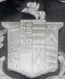Escutcheon showing hatched arms of Morrison impaling Orchard. Detail from Charlotte Orchard's mural monument.[lower-alpha 2]