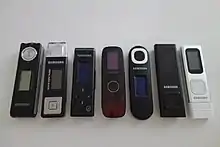 The YP-F1[15] is a necklace-like style flash digital audio player with an LCD screen. The faceplate of the player is swappable, with several color options available. Older players had the YEPP logo on the faceplate, while later models had just the SAMSUNG logo. Storage capacities include: 128 MB, 256 MB, 512 MB, and 1 GB, although the US did not receive the base 128 MB model. It connects to a computer with a USB cable to charge the 10-hour (claimed) lithium-polymer battery and transfer files. It supports the MP3, WMA (and WMA DRM), WAV, ASF, and Ogg formats. It can receive and record FM broadcasts, and supports voice recording. The size is 1.14" x 2.5" x 0.6".