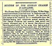 As an acting minister to the UK, Yi Han-eung contacted the British Foreign Office in London and asked for intervention in peace negotiations. However, Lord Lansdowne refused any talk with Yi Han Eung, as the UK had a common interest with Japan through Anglo-Japanese Alliance signed in 1902. He once again requested the British Foreign Office for intervention in peace negotiations on 22 March 1905, but Lord Lansdowne did nothing other than acknowledging the receipt of his memorandum on 1 April 1905. Having failed to secure British support, on 12 May 1905, Yi committed suicide in his bedroom at 4 Trebovir Rd to take responsibility for it.[7] After this, the Korean embassy in London was disestablished.[8]