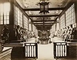 Luohan (often written luóhàn) is the Chinese term for an arhat, one of the historical disciples of the Buddha. As Buddhist tradition developed, and especially in the East Asian Buddhist countries, the number of arhats or luohans tended to increase, and at least the most important were regarded as, or as almost, bodhisattvas or fully enlightened beings, with a wide range of supernatural powers.[6] According to Buddhist tradition, groups of 16, 18 or 500 luohans awaited the arrival of Maitreya, the Future Buddha,[7] and groups were often used in East Asian Buddhist art. The full set of the so called "Yixian luohans" is thought by most scholars to have had figures for the typical Chinese main grouping of Sixteen or Eighteen Arhats, although William Watson describes this "usual assumption" as "speculative". These and earlier smaller groupings of six or eight were each given names and personalities in Buddhist tradition.[8]