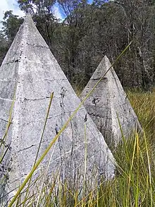 To support these wooden barriers, are eight concrete tetrahedra (two rows of four), positioned in the Wilderness Area of the Cathedral Rock National Park. The marshland is an important landform in the National Park and the installation of these permanent concrete structures was an effort to prevent enemy tanks traversing the marshland during its drier periods. The eight tetrahedra in place are approximately 1.5m high and remain in good condition, despite some deterioration to the external render. Evidence suggests the tetrahedra were cast on site in 11 layers (reinforced with steel mesh) and topped with hand-shaped cones (with some variation in height).[11][1]