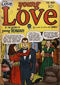 After the Sept/Oct 1947 release of Crestwood/Prize's genre-launching Young Romance comic (arguably the first romance comic[1][2]) by the prolific team of Simon & Kirby sold "millions of copies",[1] the company (and duo) swiftly prepared a separate spin-off title to capitalise on the success of this new genre. Launched amid imitators from (among others) Quality Comics, Fawcett Publications, Fox Features Syndicate and Timely Comics, Crestwood/Prize's companion title Young Love was released "less than a year and a half" after the debut of Young Romance, and it also sold well.[1][2]