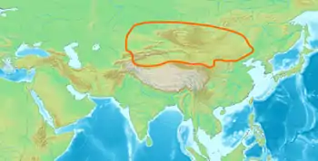 The area between the Qilian Mountains and Dunhuang lies in the western part of the modern Chinese province of Gansu, but no archaeological remains of the Yuezhi have yet been found in this area.[15] Some scholars have argued that "Dunhuang" should be Dunhong, a mountain in the Tian Shan, and that Qilian should be interpreted as a name for the Tian Shan. They have thus placed the original homeland of the Yuezhi 1,000 km further northwest in the grasslands to the north of the Tian Shan (in the northern part of modern Xinjiang).[15][33] Other authors suggest that the area identified by Sima Qian was merely the core area of an empire encompassing the western part of the Mongolian plain, the upper reaches of the Yellow River, the Tarim Basin and possibly much of central Asia, including the Altai Mountains, the site of the Pazyryk burials of the Ukok Plateau.[34]