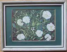 From 1985 she was part of the 8+1 Suffolk Group, a group of nine artists that teamed up together to manage and present their own exhibitions. Their first show was at Broughton Gallery, Lanarkshire in August 1985. Her main subjects were landscapes and seascapes celebrating the Suffolk countryside, along with still life pictures of flowers, plants and trees, including those growing in her own garden; she also produced occasional portraits. Her work was mainly figurative, although her later works were much more abstract in character, using vivid colours and broad brushstrokes. She is mentioned in Patrick Trevor-Roper's influential book The World Through Blunted Sight: An inquiry into the influence of defective vision on art and character (1970) as having different colour perception in each eye.[7] Her works are rarely titled, and whilst the landscapes are clearly recognisable, they are not usually particularly well-known views, although she did paint Snape Maltings and Shingle Street. She was highly commended in the 1994 Laing Art Competition. She generally worked from life and traveled around Suffolk and Norfolk in a Fiat 238 camper van seeking suitable subjects.
