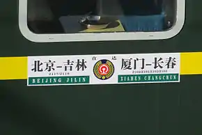The Z117/118 Beijing-Jilin Through Train (Chinese: Z117/118次北京到吉林直达特快列车) is Chinese railway running between the capital Beijing to Jilin City express passenger trains by the Shenyang Railway Bureau,[1] Jilin passenger segment responsible for passenger transport task, JIlin originating on the Beijing train. 25T Type Passenger trains running along the Jingha Railway and Changtu Railway across Jilin, Liaoning, Hebei, Tianjin, Beijing and other provinces and cities, the entire 1131 km. Beijing railway station to Jilin railway station running 14 hours and 9 minutes, use trips for Z117; Jilin railway station to Beijing railway station to run 12 hours and 17 minutes, use trips for Z118.
