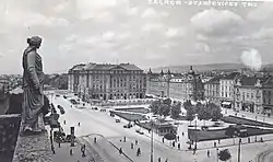 The oldest settlement located near today's Zagreb was a Roman town of Andautonia, now Ščitarjevo, which existed between the 1st and the 5th century AD.[44] The first recorded appearance of the name Zagreb is dated to 1094, at which time the city existed as two different city centers: the smaller, eastern Kaptol, inhabited mainly by clergy and housing Zagreb Cathedral, and the larger, western Gradec, inhabited mainly by craftsmen and merchants. Gradec and Kaptol were united in 1851 by ban Josip Jelačić, who was credited for this, with the naming the main city square, Ban Jelačić Square in his honor.[45]
