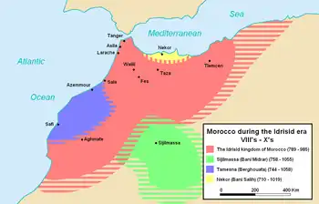 Since the earliest form of Zaydism was Jaroudiah,[17] many of the first Zaidi states were supporters of its position, such as those of the Iranian Alavids of Mazandaran Province and the Buyid dynasty of Gilan Province and the Arab dynasties of the Banu Ukhaidhir of al-Yamama (modern Saudi Arabia) and the Rassids of Yemen. The Idrisid dynasty in the western Maghreb were another Arab[22] Zaydi[23][24][25][26][27][28] dynasty, ruling 788–985.