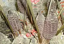 Like other cycads, Z. pumila is dioecious, having male or female plants. The male cones are cylindrical, growing to 3–15 cm long; they are often clustered. The female cones are elongate-ovoid and grow to 6–15 cm long and 4–6 cm in diameter. Pollination is done by certain insects, namely the cycad weevil Rhopalotria slossoni.