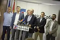 Ponoš supported the formation of a wider coalition for the 2018 Belgrade City Assembly election that would be composed of opposition parties.[48] He appeared on the ballot list, which ended up winning 19% of the popular vote.[49][50] Later that year, he supported the appointment of Milan Mojsilović as chief of the General Staff.[51] He was also one of the main representatives during the protests in 2018 and 2019.[52][53] In July 2019, he stated his opposition to participate in the 2020 parliamentary election, and called for boycott.[54] This move was later adopted by the Alliance for Serbia, of which his party was a part of.[55] He also called for citizens to boycott the parliamentary election.[56] Ponoš was re-elected as vice-president of People's Party in November 2019.[57] Shortly after the signing of the Washington Agreement in September 2020, Ponoš stated that "an occurrence of another Dritan Abazović would be more significant than the agreement".[58] At a party conference in the same month, Ponoš was chosen as the ballot representative for the upcoming Belgrade City Assembly election,[59][60] although Ponoš later rejected the offer.[61] After boycotting the 2020 election, Ponoš announced that "opposition parties will exert pressure to the government in order to hold the future election under fair conditions".[62] In early 2021, he expressed his support for a joint participation in the upcoming general election and for a joint opposition presidential candidate.[63][64] Ponoš was also one of the participants of the inter-party dialogues on electoral conditions that took place during 2021.[65] Ponoš stepped down as vice-president of the People's Party at its party conference in November 2021.[66][67]