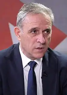 Ponoš stated in early November 2021, that he would run for the presidency if "opposition parties unite themselves at all levels".[68] Jeremić stated that he was surprised by this move,[69] and he stated that the candidate should be rather reached by consensus between opposition parties.[70] Sanda Rašković Ivić condemned the attacks that were done by pro-government media and MPs.[71] On 22 January, the Party of Freedom and Justice proposed Ponoš as a joint opposition candidate, while Jeremić stated that his party is ready to back him up.[72][73] Leaders of the coalition held discussions on 28 and 29 January, after which they concluded their support for Ponoš as presidential candidate.[74][75][76][77] On 2 February, Ponoš was presented as the presidential candidate of the United Serbia coalition.[78] His candidacy was confirmed by the Republic Electoral Commission (RIK) on 6 March.[79] Beginning in February, Ponoš has announced his advisors who would cooperate with him if he gets elected president.[80][81][82] During his campaign, Ponoš held rallies in cities and towns across Serbia.[83][84] He placed second in the presidential election, after winning 18% of the popular vote.[85] Following his election loss, Ponoš left the People's Party.[86] He had stated that he might continue cooperating with Dragan Đilas.[87]