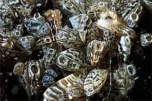 The lifespan of a zebra mussel is four to five years.[7] A female zebra mussel begins to reproduce within 6–7 weeks of settling.[13] An adult female zebra mussel can produce 30,000 to 40,000 eggs in each reproductive cycle, and over 1 million each year.[14] Free-swimming microscopic larvae, called veligers, drift in the water for several weeks and then settle onto any hard surface they can find. Zebra mussels also can tolerate a wide range of environmental conditions, and adults can even survive out of water for about 7 days.[15]