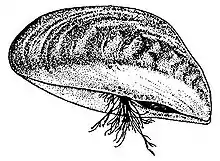 The species was first described in 1769 by German zoologist Peter Simon Pallas in the Ural, Volga, and Dnieper Rivers.[4] Zebra mussels get their name from a striped pattern commonly seen on their shells, though it is not universally present. They are usually about the size of a fingernail, but can grow to a maximum length around 2 in (5.1 cm).[5][6] Shells are D-shaped, and attached to the substrate with strong byssal fibers, which come out of their umbo on the dorsal (hinged) side.