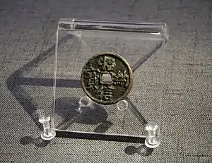 To this end Liu Guangshi ordered the creation of special cash coins with the inscription Zhaona Xinbao (招納信寶) which could be translated as "Treasure (coin) that recruits (Jin dynasty) soldiers who desire to return to their home" and adopted a policy that these special cash coins could be used to show that their defection from the Jin Army.[4] When soldiers of the Jin Army were captured by the troops of Liu Guangshi rather than having them killed, he had them treated in a good manner and they were presented these Zhaona Xinbao coins and informed that anyone in possession of these coins could pass unhindered tov the Song camp and then if they choose return safely back to their home. The captured Jin servicemen were then given handed these Zhaona Xinbao coins and were informed after they return to the Jurchen camp that they could hand these over to their compatriots who desired to desert to the Song. These captured Jin soldiers then returned to the Jin camp and secretly distributed these coins to other soldiers who also expressed a desire to defect.[5][6]
