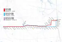 On 26 November 2016, the service was extended to Zhengzhou East railway station, and became the fastest bus service connecting west Zhengzhou and Zhengzhou East railway station.[2] On the same day, two interval services of the route B501 and B502 were commenced, connecting Zhengzhou railway station to the route.[3]