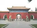 Of all the gardens and parks surrounding the Forbidden City, such as the Beihai and Jingshan, Zhongshan is arguably the most centrally located of them all.[1] The Zhongshan Park houses numerous pavilions, gardens, and imperial temples such as the Altar of Earth and Harvests or Altar of Land and Grain in some translations (Shejitan, 社稷坛), which was built in 1421 by the Yongle Emperor,[2] and it symmetrically opposite the Imperial Ancestral Temple, and is where the emperors of Ming and Qing dynasties made offerings to the gods of earth and agriculture.[1] The altar consists of a square terrace in the centre of the park.