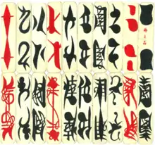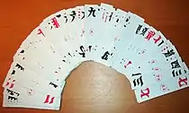 These cards originated from Leshan, Sichuan during the middle of the Qing dynasty and then spread outwards to other parts of southern China. The special deck has two series of cards numbered from one to ten.[2] One series of cards features numbers written in an "ordinary" style (数字小写), while the other series of cards has numbers written in a "formal" style (数字大写). Every card is quadrupled to bring the total to 80 cards.[2] Numbers 2, 7 and 10 are printed in red, and all others are printed in black.[3] Some decks may have extra cards that act as wild cards.