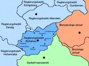 Regierungsbezirk Zichenau was a Regierungsbezirk, or administrative region, of the Nazi German Province of East Prussia in 1939–45. The regional capital was Zichenau (Ciechanów).[1] It was also referred to under the designation of South East Prussia (German: Südostpreußen) which, however, was later sometimes also applied to Bialystok District, although the latter was not incorporated into, but merely attached to East Prussia.