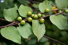 It is a spreading, sometimes climbing, thorny shrub growing to 1.5 m in height. The leaves are simple, alternate, ovate-lanceolate, acute and oblique. The flowers are green, in subsessile axillary cymes. The fruit is a globose drupe, black and shiny when ripe, containing a single seed.[2]