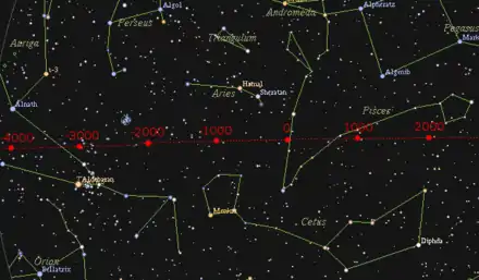 Due to the precession of the equinoxes, the time of year the Sun is in a given constellation has changed since Babylonian times, the point of March equinox has moved from Aries into Pisces.[16]