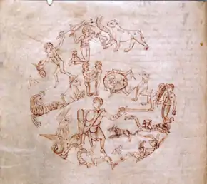 The English word zodiac derives from zōdiacus,[5] the Latinized form of the Ancient Greek zōidiakòs kýklos (ζῳδιακός κύκλος), meaning "cycle or circle of little animals". Zōidion (ζῴδιον) is the diminutive of zōion (ζῷον, "animal"). The name reflects the prominence of animals (and mythological hybrids) among the twelve signs.