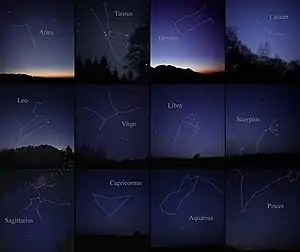 In Western astrology, and formerly astronomy, the zodiac is divided into twelve signs, each occupying 30° of celestial longitude and roughly corresponding to the star constellations: Aries, Taurus, Gemini, Cancer, Leo, Virgo, Libra, Scorpio, Sagittarius, Capricorn, Aquarius, and Pisces.[2][3]