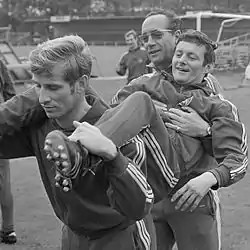 ![]() Čebinac carried by 1. FC Nürnberg teammate Fritz Popp and head coach Max Merkel during training in September 1968 ahead of the European Cup second leg game versus Ajax. | |||